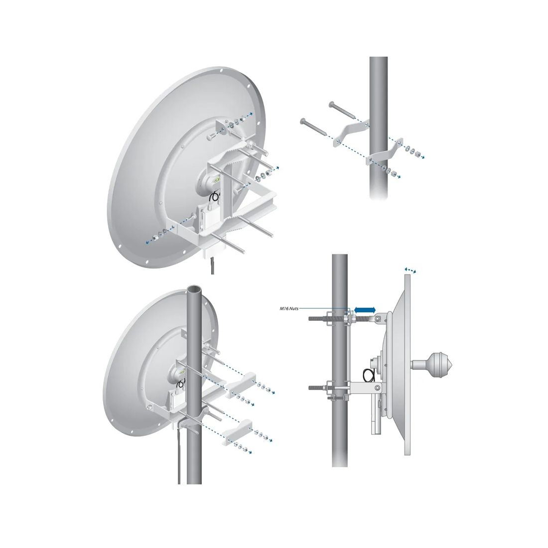 Антенны, Ubiquiti, RD-5G34, RocketDish 5G-34, 34 dBi, 3 °, Параболическая, 2х2 MIMO, 5 ГГц Антенна RocketDish 5G-34 относится к типу параболических и используется для создания радиоканалов на значительных расстояниях — вплоть до 50 км. Модель работает в частотном диапазоне 5 ГГц, что допускает ее использования в городской черте. Частотный диапазон 4900-5800 МГц Усиление 34 дБи Поляризация Двойная линейная Изоляция поперечной поляризации -50dB(RX), -65 dB(TX) Максимальный КСВ 1.4:1 Угол излучения в горизонтальной плоскости 3.8 (RX), 6.6 (TX) Угол излучения в вертикальной плоскости 3.8 (RX), 6.6 (TX) Соотношение фронт/тыл -35 дБ Стандарт ETSI EN 302 326 DN2 Диаметр тарелки 1050 мм Вес 13.5 кг Максимальная ветровая нагрузка 120 миль в час Нагрузка на точку опоры при скорости ветра 161 км/ч 52 кг