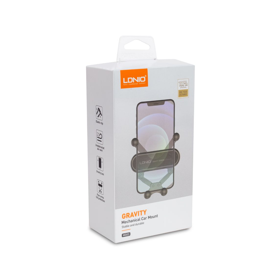 Автомобильный держатель для телефона LDNIO Gravyty MG03, Зажим Чёрный В наше время долгих пробок, простых и частых перемещением по городу или нередких дальних поездок на автомобиле постоянно держать телефон в руках крайне неудобно. На помощь приходит современный Автомобильный держатель для телефона LDNIO Gravyty MG03, Зажим Чёрного цвета отлично подойдёт к интерьеру большинства автомобилей. Корпус изготовлен из высокопрочной пластмассы.