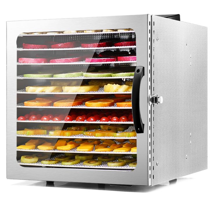 Электрическая сушилка представляет собой корпус с нагревательным элементом и вентилятором, в который устанавливается набор поддонов. Некоторые модели дополнительно оснащаются дисплеями, регуляторами температуры, таймерамии другими полезными приспособлениями. Процесс сушки плодов с помощью таких аппаратов предельно прост. Фрукты или овощи нужно порезать ломтиками, разложить на поддоны и поместить в сушилку. После этого устройство закрывается и нажимается кнопка включения. В некоторых моделях можно предварительно установить нужную температуру. Заготовка плодов совершается под воздействием циркуляции нагретого воздуха, причем созревают они намного быстрее, чем при традиционном высушивании. Сушилка для пищевых продуктов 10 лотков из нержавеющей стали для обезвоживания закусок, фруктов, овощей и ванили. Спецификация: Рабочее напряжение: 220 В Номинальная частота: 50 Гц/60 Гц Мощность: 1000 Вт Режим работы: кольцевой Количество этажей: 10 этажей Регулировка температуры: 30-90°c Материал корпуса: нержавеющая сталь