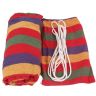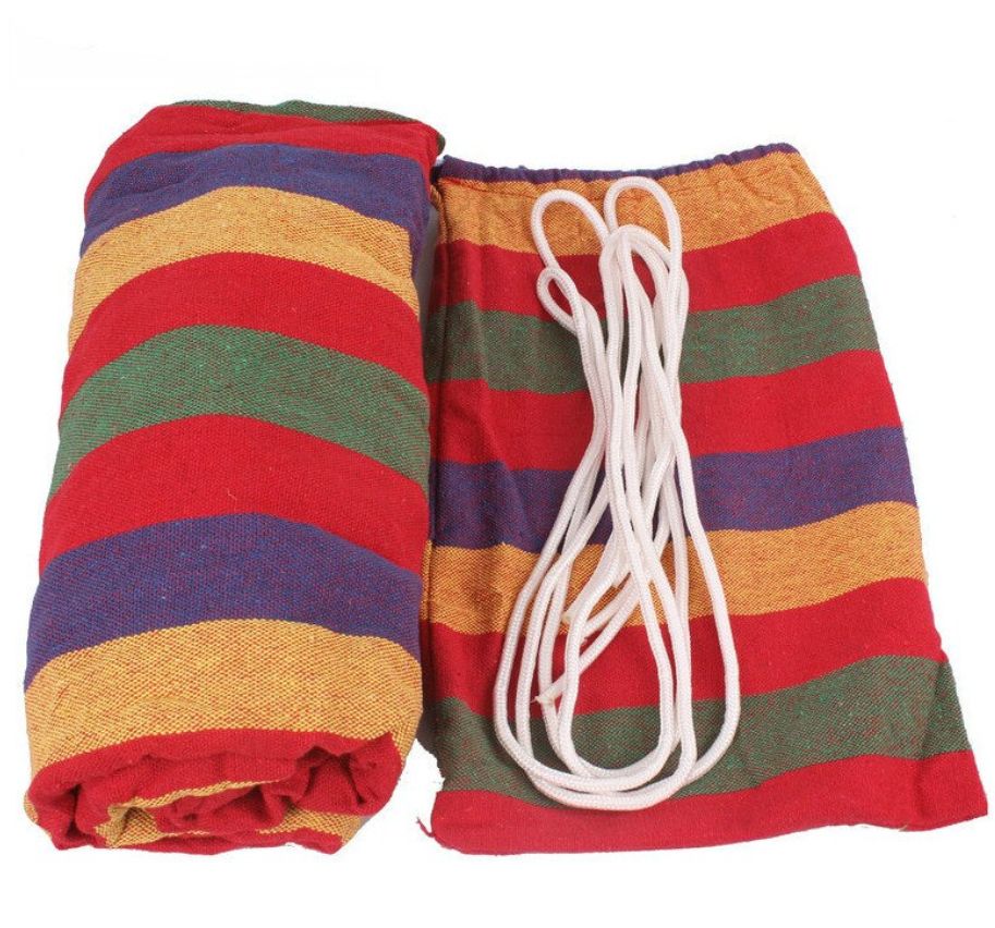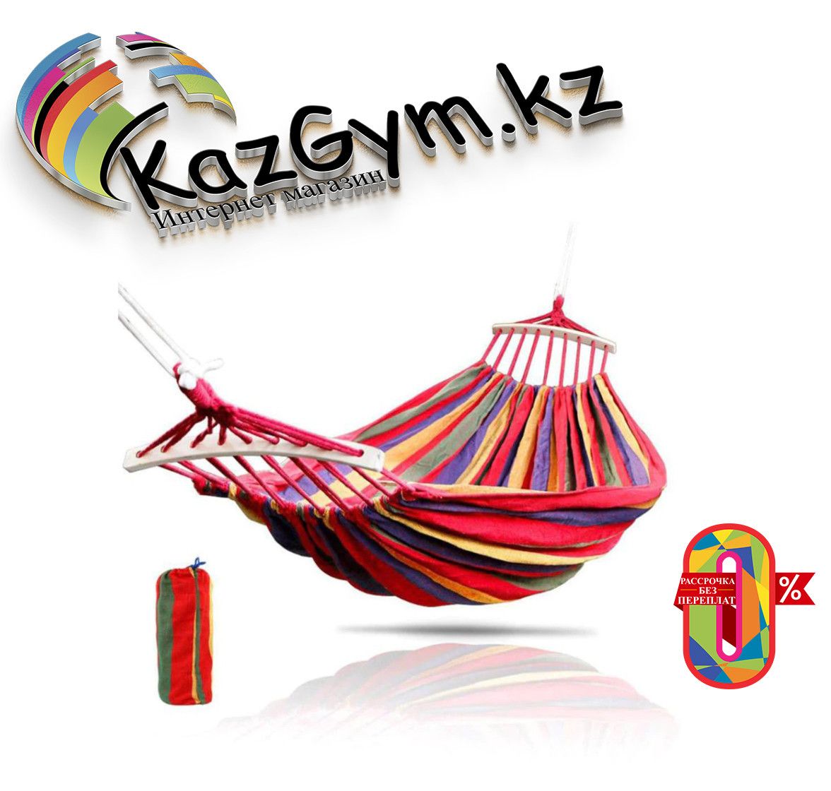 Подвесной гамак – это самая настоящая классика. Такое ложе крепится на две опоры. На даче такими опорами обычно служат деревья, но если подходящих нет, то можно использовать предварительно установленные и надежно забетонированные столбы. В квартирах такой тип гамака крепится к потолку или стенам. Подвесные гамаки могут иметь планки на концах ложа или же обходится без них. Модели без планок стоят дешево, легко складываются, занимают минимум места и без проблем транспортируются, а многие сравнивают такие гамаки с колыбелью, так как они буквально обволакивают спящего. С другой стороны, эти модели обычно рассчитаны только на одного человека и не всем будут удобны. Наличие планок позволяет сделать полотнище гамака более натянутым. Чтобы понять, какой гамак будет более комфортным и подходящим, лучше устроить практическое испытание. К общим достоинствам подвесных гамаков относят: небольшую цену; компактность и простоту транспортировки; большое разнообразие; простоту установки. Характеристики: Тип ложа: цельное полотно; Тип гамака: одноместный; Материал гамака и веревок: хлопок; Каркас: нет; Сетка/навес: нет; Размеры полотна: 200х100 см; Длина гамака вместе с петлями: 2,5 м; Размеры в сложенном виде: 38х20х15 см; Максимальный вес нагрузки: 120 кг; Цвет: как на фото; Принт: линейный, разноцветный; Вес: 1,3 кг. Комплектация: гамак-качеля, 2 веревки для подвешивания, чехол