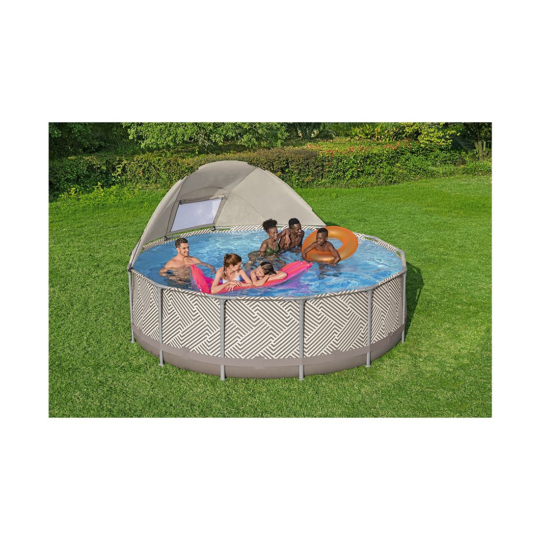 Каркасный бассейн Steel Pro MAX 396 х 107 см, BESTWAY, 561FY, Винил, 11133 л., Стальной каркас, С навесом, Ф-насос 58383 (2006л/ч), Лестница 58335, Тент 58292, Текстильный принт, Цветная коробка Каркасный бассейн Bestway отличается высокой прочностью и устойчивостью. Чаша выполнена из высококачественного трехслойного ПВХ: два слоя плотного винила и один - стекловолокно для особой прочности. Каркас металлический нержавеющий оцинкованный. Отличительной особенностью данной модели является навес от солнца. Не требует бетонирования и подготовки ямы, все, что нужно, это плоская, горизонтальная площадка. Сезонный бассейн (рекомендуется разбирать на холодное время года) обладает простой конструкцией - может быть легко разобран и собран заново. Время сборки и подключения бассейна примерно 30-40 минут.Удобный сливной клапан позволяет присоединить садовый шланг, что дает возможность слить воду в любое место. Материал чаши: высококачественный трехслойный винил 0.56 мм (дно 0.56 мм); Материал каркаса: усиленные оцинкованные стальные трубы (овальной формы) с порошковой окраской (снаружи и внутри); Диаметр: 396 см Высота: 107 см Объём бассейна: 11133 л. Тип подключения аксессуаров: хомуты, стандарт 32 мм; Время монтажа: 30-40 минут + наполнение водой. Комплектация Съемный навес, защищающий от солнца с встроенным окошком; Фильтрующий насос 58383 (2006л/ч) с картриджем 58094 (тип II); Дозатор для химии Chemconnect 58501; Лестница 58335 (107 см); Тент 58292; Клапан для слива воды; Ремкомплект.