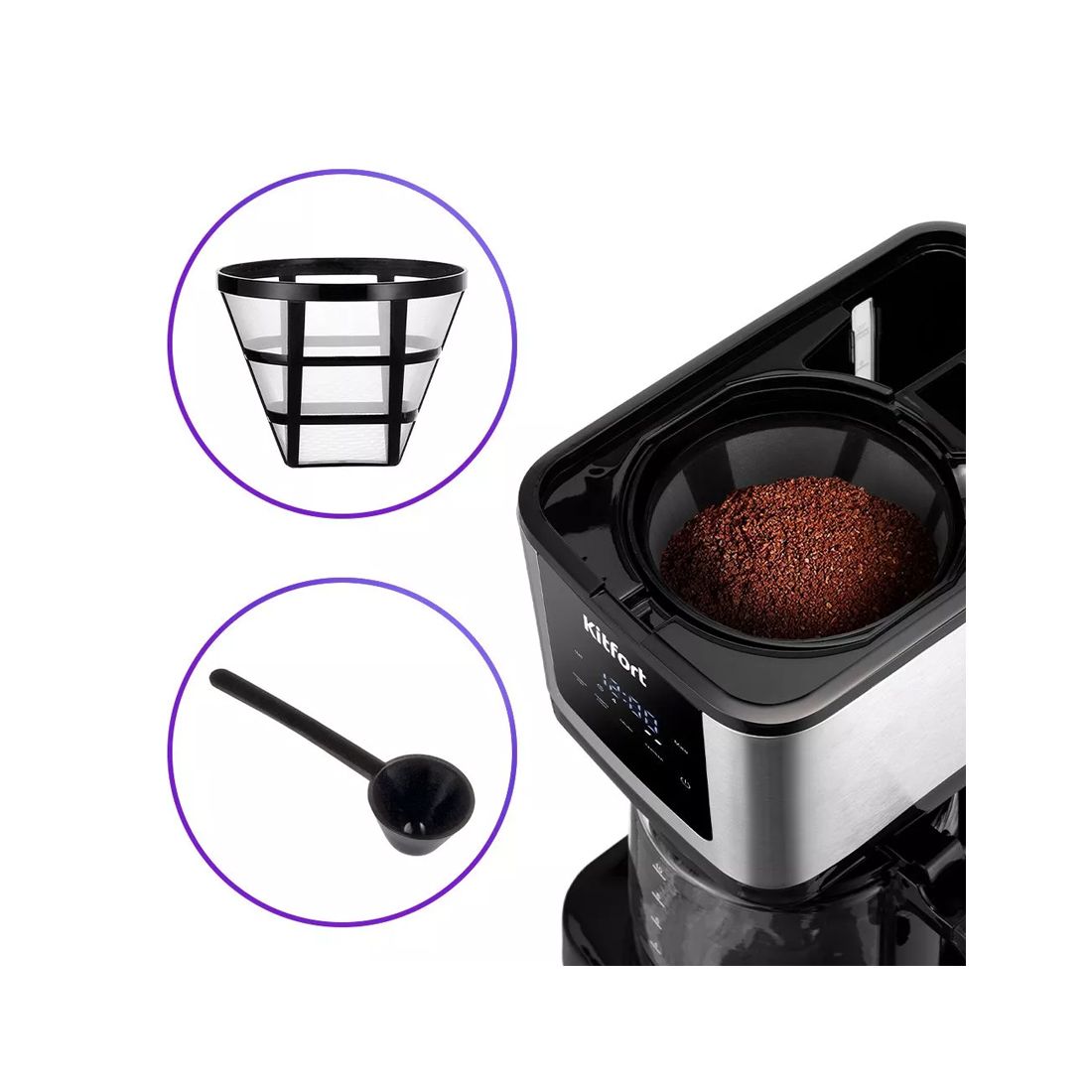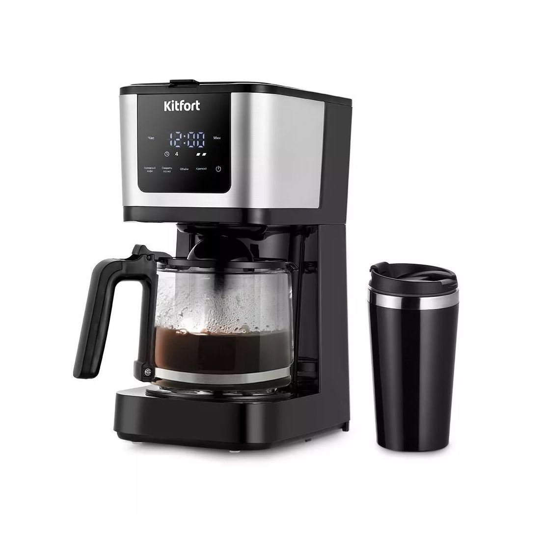 Кофеварка капельная Kitfort КТ-7217 Время бодрости! Капельная кофеварка КТ-7217 готовит ароматный чёрный кофе из молотого кофе. Она компактная и простая в использовании. Кофеварка идеально подойдёт для приготовления кофе в домашних условиях или в офисе. Выбирайте объём, настраивайте крепость Вы можете настроить объём напитка: 4, 6, 8 и 10 чашек. Также кнопкой на панели управления можно регулировать крепость кофе. Чем более крепкий кофе выбран, тем больше индикаторов «Крепость» будет гореть. Кофе с собой Вы можете приготовить кофе сразу в стакан для кофе и взять его с собой. Для приготовления кофе вам понадобится около 24 г молотого кофе и 400 мл воды. Идеальный объём Резервуар для воды ёмкостью 1,25 л позволяет за один раз приготовить кофе на 10 чашек (по 125 мл). На резервуаре для воды и кофейнике нанесены соответствующие отметки, поэтому вам будет удобно приготовить нужное количество чашек кофе. Объём кружки 400 мл. Хватит надолго Кофеварка оснащена нейлоновым фильтром, которым можно пользоваться неограниченное количество раз. Его удобно мыть после приготовления кофе и использовать снова. Для удобства использования в комплекте идёт мерная ложка. Для идеальной температуры напитка По окончании приготовления кофеварка перейдёт в режим подогрева. Платформа с подогревом будет горячей в течение 40 минут, затем кофеварка выключится. Для стакана для кофе предусмотрен защитный коврик, чтобы внешняя часть стакана не нагревалась. Просыпаемся с ароматом кофе! Функция отложенного старта позволит начать приготовление кофе в заданное время. Установите время приготовления, и к моменту, когда вы проснётесь, вас будет ждать ароматный свежеприготовленный кофе. Система «капля-стоп» Кофеварка оборудована противокапельной системой - затвором, приостанавливающим подачу кофе при вынимании кофейника из кофеварки. Вы можете налить кофе в чашку, не дожидаясь окончания приготовления. Холодный кофе? Легко! Кнопка «Холодный кофе» включает и выключает приготовление холодного кофе. Добавьте в фильтр молотый кофе, а в кофейник около 500 г льда. Нажмите на кнопку «Холодный кофе», начнётся приготовление 6 порций. По завершении платформа с подогревом не включится. Простое очищение Капельная кофеварка КТ-7217 удобно разбирается для быстрого ухода – так прибор легко поддерживать в чистоте. Фильтр и воронку важно очищать после каждого использования. Новая дизайнерская коллекция КТ-7217 выполнен в стильной дизайнейской коллекции «Penguin Pack». Новый маскот данной линейки - пингвин по имени Питер. В комплекте с прибором вы найдёте креативный магнит с этим персонажем. Соберите всю коллекцию китов и пингвинов! Идеально в качестве подарка Помимо стильного внешнего исполнения и коллекционного магнита в комплекте, прибор упакован в фирменную коробку в дизайне коллекции «Penguin Pack». Остаётся лишь выбрать повод и вручить подарок! Характеристики: Основной цвет черный Мощность 900 Вт Объем резервуара для воды 1250 мл Объем резервуара для кофе 1...