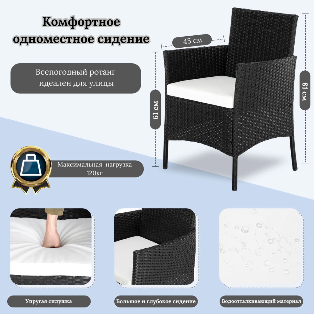 Комплект мебели садовой ART-Wave „Торонто-3“ (4 в 1) Создайте стильный и комфортный уголок для отдыха на свежем воздухе с комплектом садовой мебели ART-Wave „Торонто-3“ (4 в 1). Элегантный комплект, выдержанный во всём — качество, эстетика и удобство объединены в одной модели. Особенности комплекта: Полный комплект для 4 персон: включает двухместный диван, два кресла и стильный столик — идеально для дружеской беседы или семейного чаепития. Диван 99х45х81см Стол 71х40х38см Кресло 45х58х81см Надёжная и долговечная конструкция: металлический каркас обеспечивает прочность, а искусственный ротанг — устойчивость к погодным условиям и лёгкость в уходе. Максимальная нагрузка 100кг Комфорт и уют: спинки и сиденья дополнены мягкими подушками, делая пространство по-настоящему располагающим. Практичный дизайн: компактные габариты подходят для сада, террасы или балкона, а чёрный цвет легко интегрируется в любой ландшафт или интерьер. ART-Wave „Торонто-3“ — гармония стиля и функциональности для вашего уличного пространства. Наслаждайтесь общением на свежем воздухе с комфортом и элегантностью.