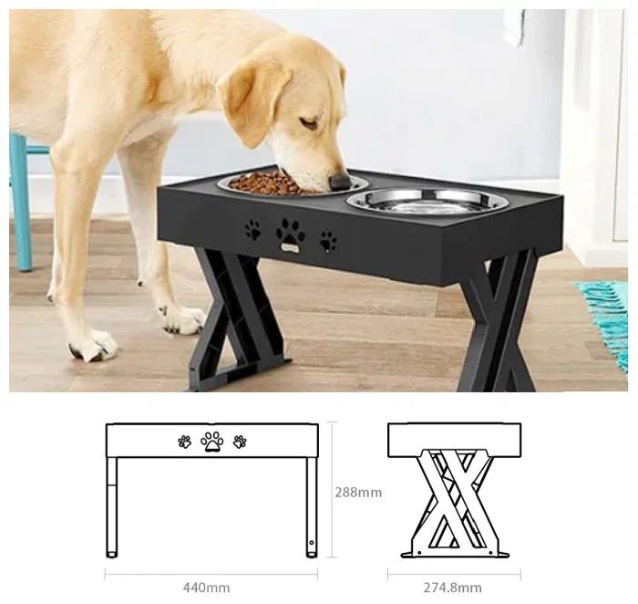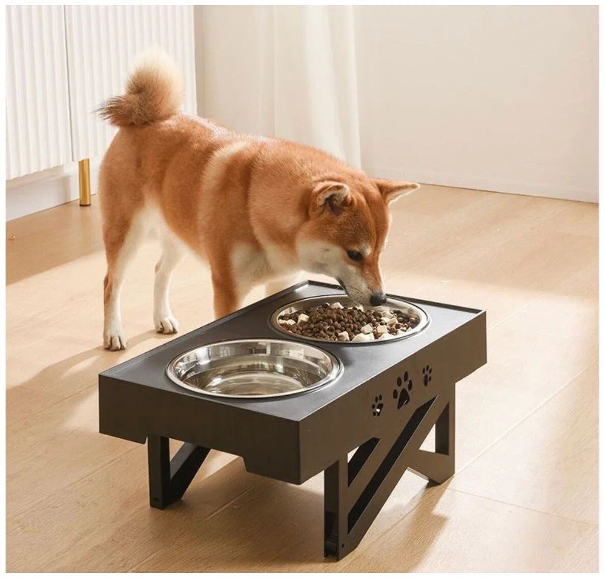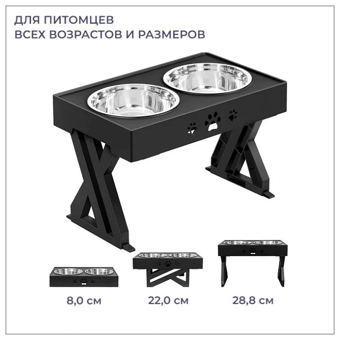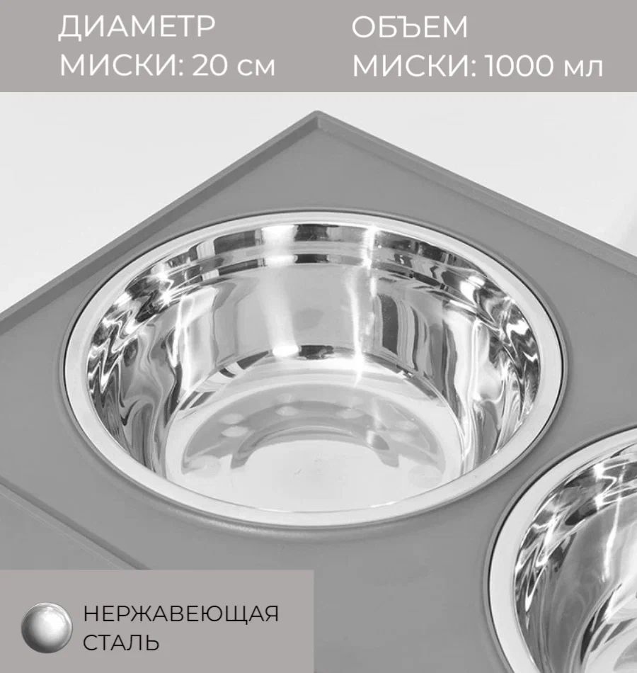 Двойная миска для собак на подставке с регулировкой по высоте (три положения): - две миски из нержавеющей стали объемом 1л; - подставка изготовлена из качественного и безопасного ABS-пластика; - три уровня высоты подставки (7 см, 22.5 см, 28 см) для питомцев разного роста и возраста; - противоскользящие накладки на ножках для устойчивости; - удобна в транспортировке - ножки не занимают много места, просто собрать и разобрать; - проста в уходе - легко мыть и миски, и подставки.
