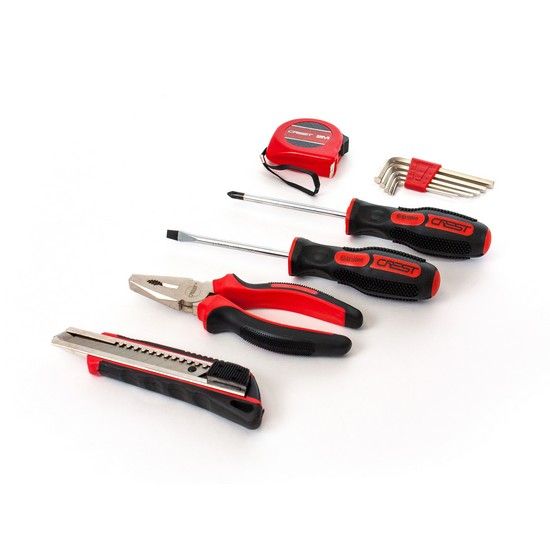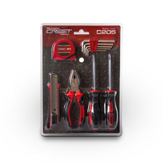 Набор инструментов CREST C205 Набор инструментов состоит из 10 наименований. Канцелярский нож – 1 шт. 6" Комбинированные плоскогубцы – 1 шт. 5x75 Отвёртка – 2 шт. Шестигранные ключи - 5 шт. Рулетка, 2 метра - 1 шт.