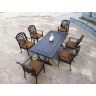 Размер стола, см: 180х99х74см Размер стула, (ШхГхВ): 61.5х52х98см Садовая кованая мебель является незаменимым атрибутом для людей, любящих отдыхать на свежем воздухе с максимальным удобством. Именно поэтому популярность подобной продукции растет с каждым годом. В кованой мебели идеально сочетается надежность и привлекательный внешний дизайн. С ней не сравниться ни пластик, ни плетеная мебель, ни даже дерево. При этом чаще всего преданная и долговечная любовь к кованым элементам интерьера возникает после одного мимолетного взгляда на чью-то терассу, заставленную металлической мебелью. Однако красивая внешность — это еще не самое главное, ведь кованная мебель для сада отличается длительным эксплуатационным периодом и минимальной сложностью в использовании. При правильном уходе она может прослужить несколько столетий. Достоинства металлической садовой мебели 1. Кованая мебель для сада не страдает от резкой перемены климатических условий и не подвержена коррозийным разрушениям. Такая устойчивость является результатом применения специального покрытия с антикоррозийным эффектом. 2. Все материалы, использованные для изготовления, не нуждаются в деликатном уходе. 3. Уровень устойчивости к механическому воздействию у кованой мебели значительно выше, чем у элементов интерьера из других материалов, поэтому ее не нужно прятать от детей или домашних питомцев. 4. Средний срок использования подобной мебели исчисляется столетиями. 5. Дизайн кованой мебели для сада идеально вписывается практически в любую ландшафтную стилизацию. Необходимо обращать внимание только на соответствие украшающих элементов.