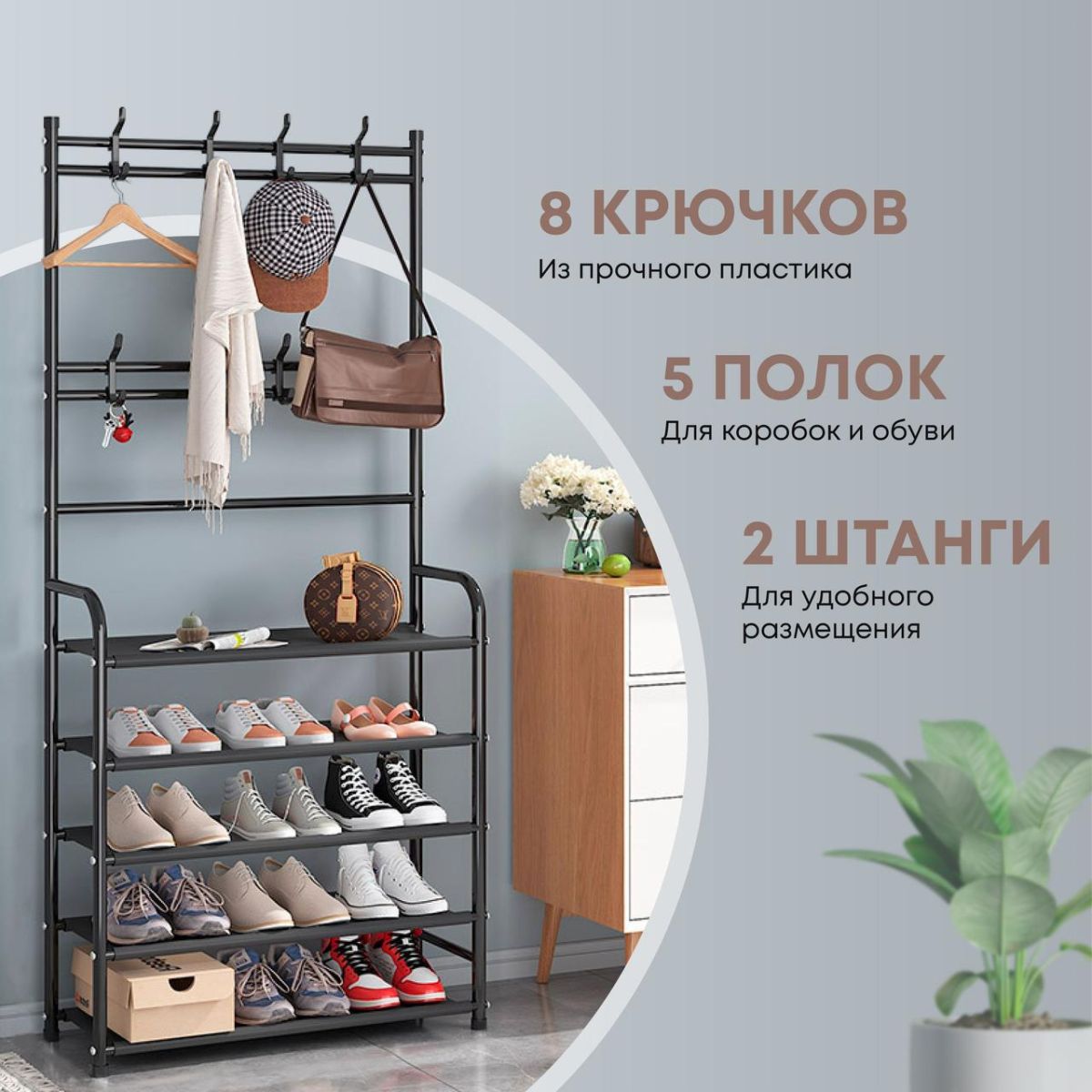 Стильно и функционально Если вы ищете стильное и функциональное решение для хранения одежды и обуви, то наша напольная вешалка с полками и крючками – отличный выбор. Она поможет держать вашу одежду в порядке, экономить место и добавит элегантности в ваш интерьер Вместительно и удобно Вешалка напольная для прихожей или комнаты состоит из 2-х расположенных на разном уровне (для взрослых и детей) штанг с крючками (8 шт.) и 5-и полок. На ней можно разместить одежду, обувь, аксессуары, коробки. Полки выполнены из надежного нетканого материала, который не деформируется под весом обуви и легко моется. Каждая полка вмещает несколько пар обуви Вешалка выдерживает общую нагрузку до 20 кг Компактно и легко Вешалка напольная имеет компактные размеры. Это позволяют установить ее даже в совсем небольших помещениях. Благодаря небольшому весу – 2 кг, вешалку легко можно передвинуть, перенести в другое место, перевезти Просто и надежно Вешалка изготовлена из прочного и легкого метало-пластика. Все ее элементы легко собираются без специальных инструментов. Инструкция по сборке прилагается к товару, что делает процесс сборки быстрым и простым.