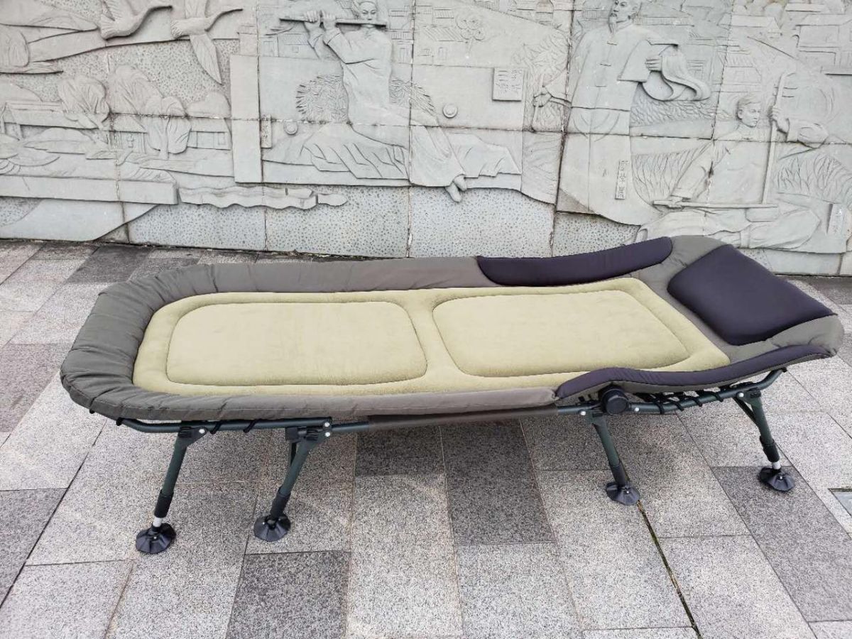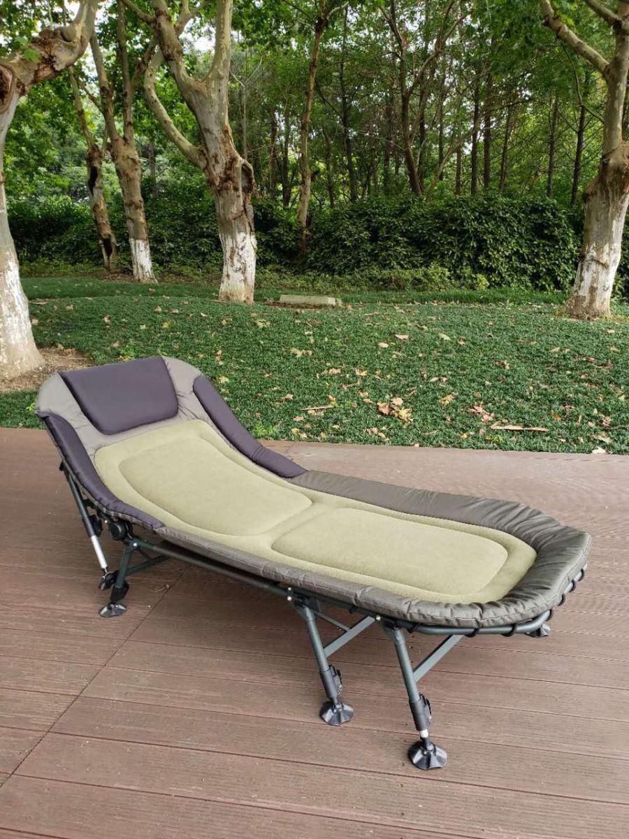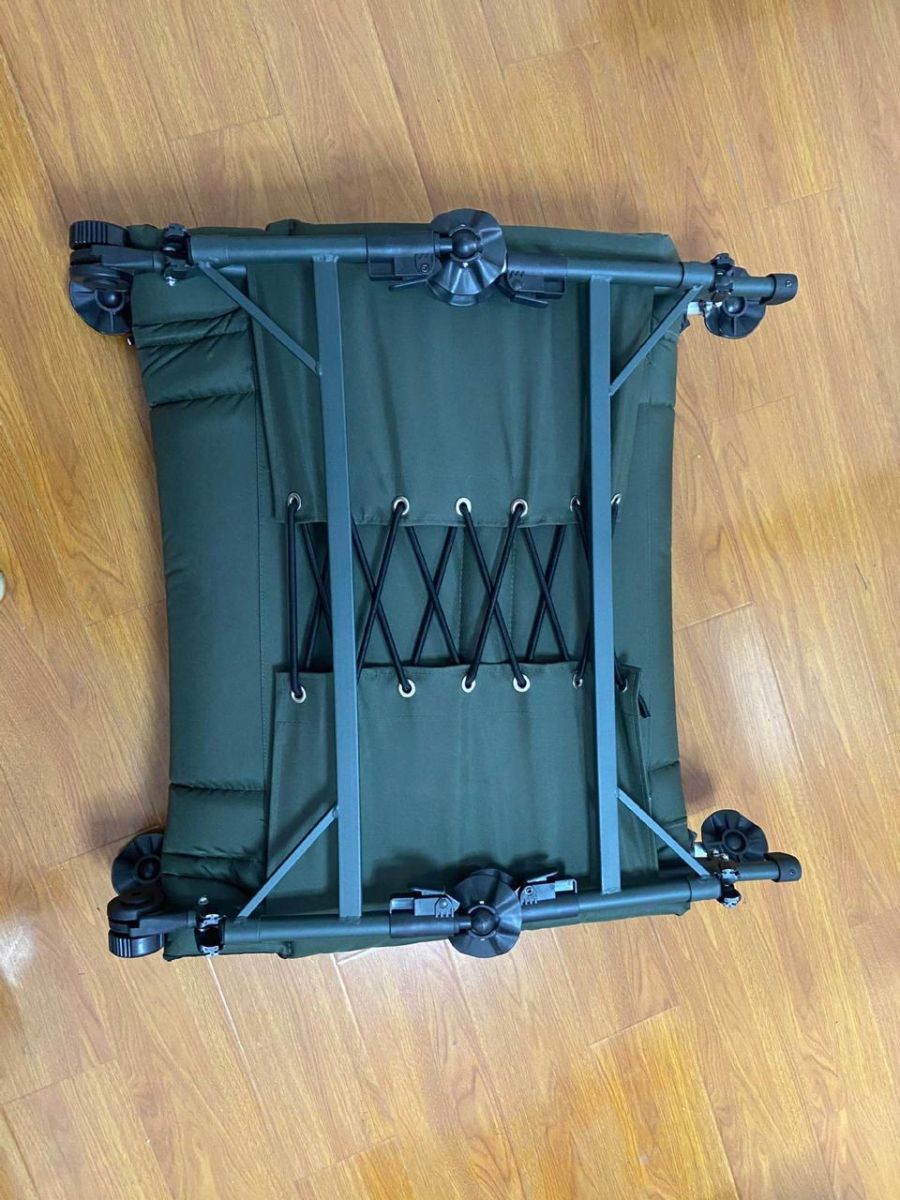 Описание Карповая раскладушка Размеры: ДхШхВ 195х80х38см Карповые раскладушки, по сравнению с обычными, кемпинговыми, имеют ряд отличительных особенностей, которые делают наш отдых на природе еще более комфортным. В отличие от обычной, у карповой раскладушки ножки (каждая по отдельности) регулируются по высоте. А теперь по порядку. Какие особенности? Угол раскладывания спинки от 0 до 180 градусов. Карман с подушкой в головной части раскладушки на замке «молния» Зубчатый механизм регулировки угла наклона головной части. Органайзер на раме с двумя карманами на молнии и карманом под бутылку Количество ножек – шесть независимо регулируемых по высоте ножек с широкими опорами. Диаметр опор – 9 см Благодаря этому вы всегда сможете расположить раскладушку ровно на любой неровной поверхности. За счет высоты ножек вы избегаете контакта с холодом, идущим от земли. И, наконец, под раскладушкой вы всегда сможете разместить большое количество вещей, что позволит вам освободить дополнительное пространство в палатке или шатре. Мягкий матрас крепится к раме раскладушки при помощи эластичных жгутов. Вы можете ослабить или усилить их натяжение и отрегулировать матрас под себя. Сложная спинка матраса служит для дополнительного комфорта. В головной части матраса мягкая подушка. У карповых раскладушек есть регулировка угла наклона головной части. Причем угол наклона может быть любым – какой вам наиболее комфортен. Этого позволяет достичь надежный узел регулировки наклона, обе части которого имеют зубчатое соединение и жестко фиксируют головную часть под заданным углом. Регулировка угла наклона головной части позволяет в дневное время раскладушке трансформироваться в удобный шезлонг или кресло для рыбалки. В головной части раскладушки находится карман под подушку, который застегивается замком «молния». Вы можете пользоваться штатной подушкой, которая идет в комплекте, либо положить туда свою. При использовании карповой раскладушки, вы никогда не будете бояться прорвать пол палатки или шатра ее ножками. Ножки раскладушки заканчиваются пластиковыми «пятаками» диаметром 9.5 см.