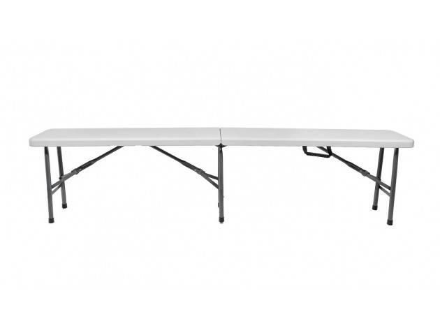 Складная скамья ZD183 — идеальное решение для большой компании. С ней можно спокойно отправляться и на дачу, и в небольшой поход до ближайшего озера. Благодаря тому, что изделие в сложенном виде представляет собой чемодан с ручкой, его можно положить в багажник автомобиля или просто понести в руках. А в разобранном виде длина сиденья составляет 1830 мм. Оно сделано из полиэтилена высокой плотности HDPE толщиной 45 мм. Крепкая конструкция основания из стальной трубы D22 мм обработана защитным полимерным покрытием. Это позволит не беспокоится о коррозии металла и существенно продлевает жизнь изделию. Максимальная нагрузка на изделие — 250 кг. Ножки модели оснащены стопором, поддаются фиксации. Размеры: 183х30х43см
